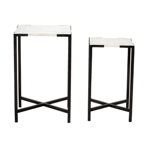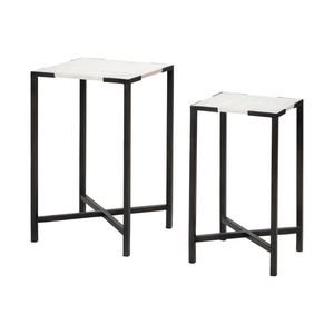 The Lucas is a set of two ritzy, square-shaped side tables featuring a white, marble top that flaunts a natural, crackled pattern. The luxurious marble top on the two tables is perched atop a four-legged, matte-black polished iron frame with cross bracing for added stability.