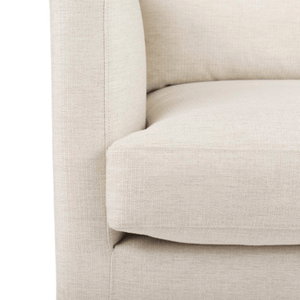 High-quality fiber and feather filling offer a soft, but firm sit and a full, structured look. A weighty back cushion provides sink-in comfort against a deep, supportive frame with a high track arm, perfect for propping pillows and slouching in. The piece is neatly finished with solid Beech wood feet and locked in place by robust alligator clips.